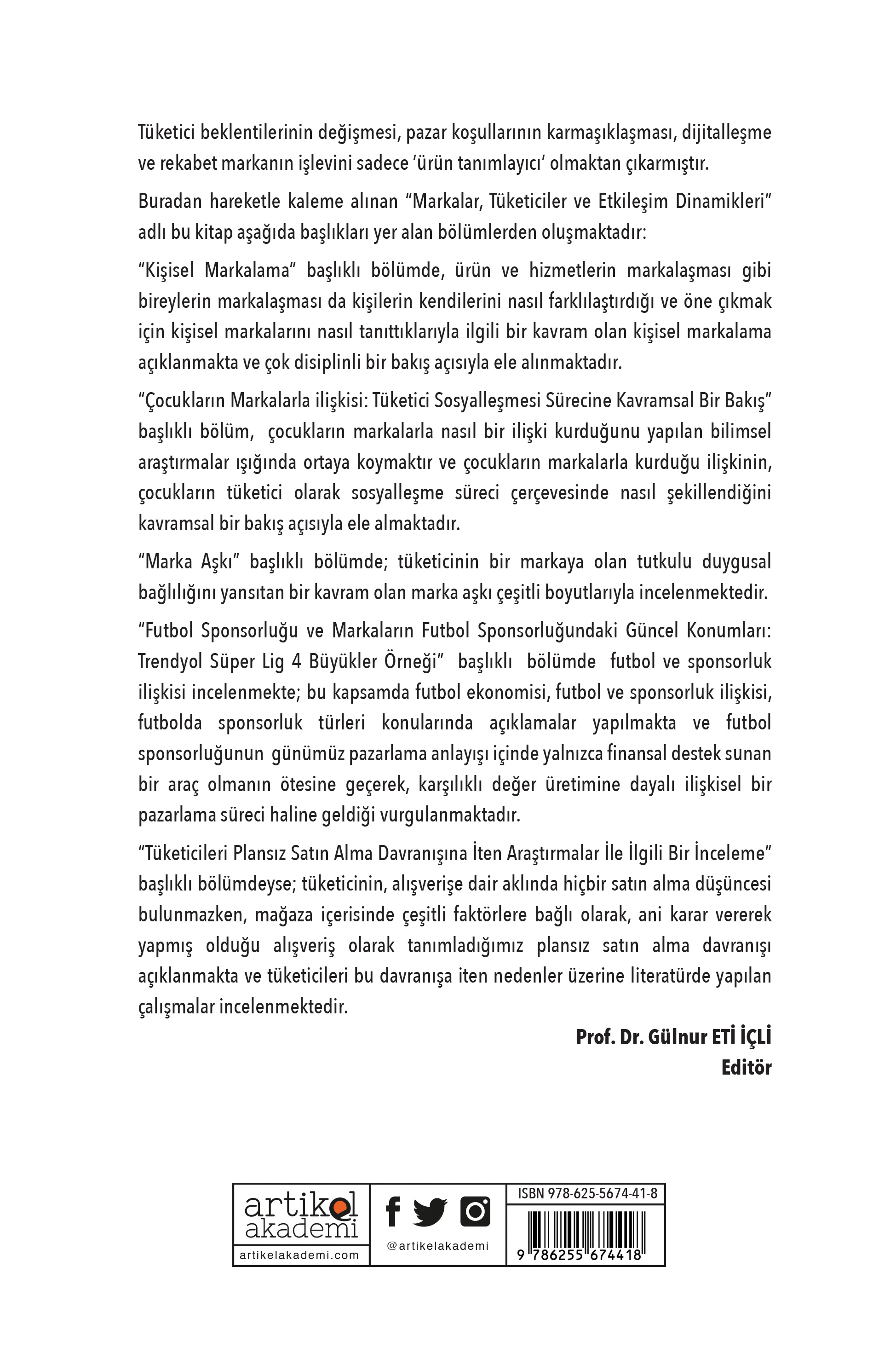 Tüketici beklentilerinin değişmesi, pazar koşullarının karmaşıklaşması, dijitalleşme ve rekabet markanın işlevini sadece ‘ürün tanımlayıcı’ olmaktan çıkarmıştır. Buradan hareketle kaleme alınan “Markalar, Tüketiciler ve Etkileşim Dinamikleri” adlı bu kitap aşağıda başlıkları yer alan bölümlerden oluşmaktadır: