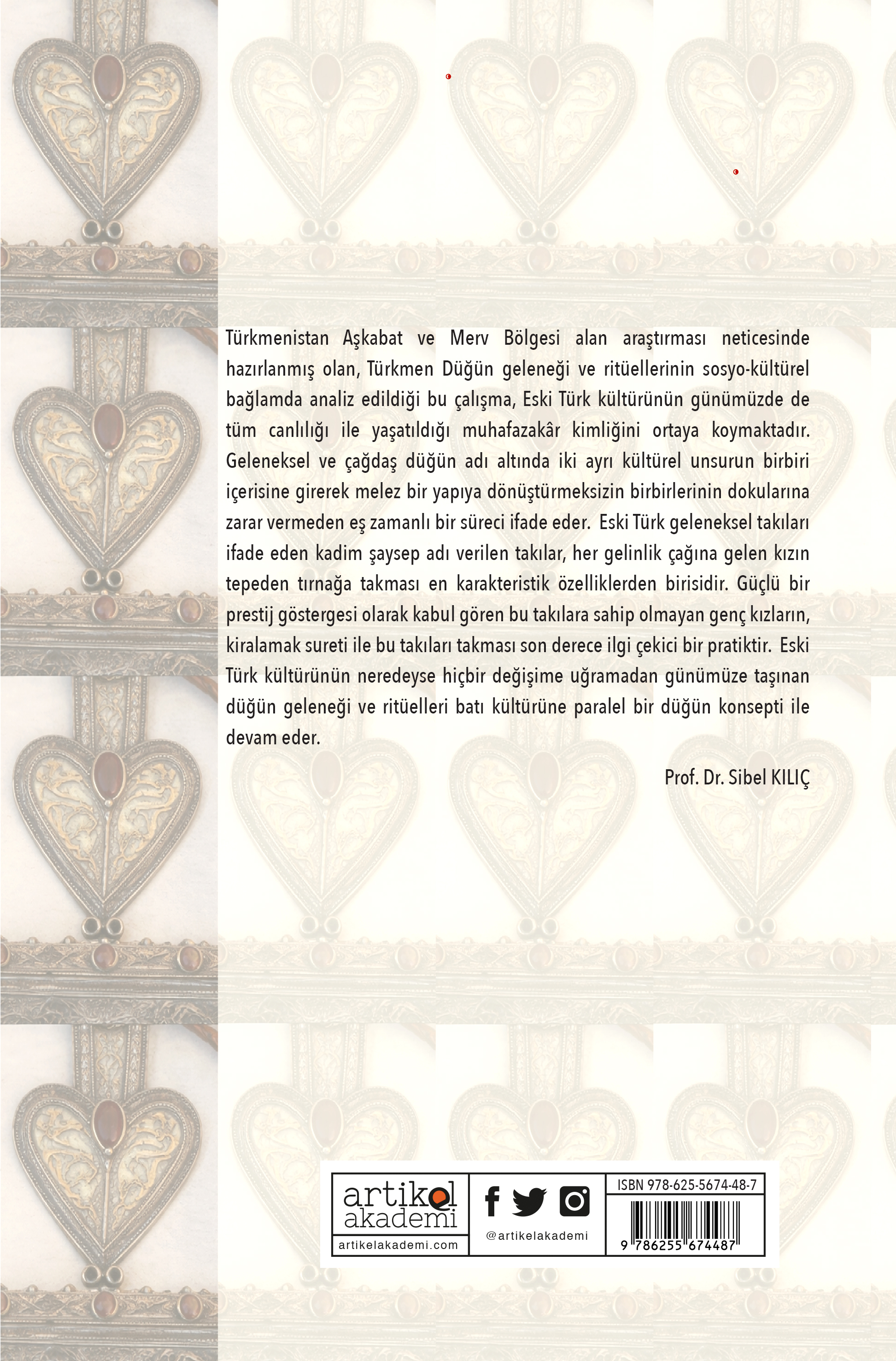 Türkmenistan Aşkabat ve Merv Bölgesi alan araştırması neticesinde hazırlanmış olan, Türkmen Düğün geleneği ve ritüellerinin sosyo-kültürel bağlamda analiz edildiği bu çalışma, Eski Türk kültürünün günümüzde de tüm canlılığı ile yaşatıldığı muhafazakâr kimliğini ortaya koymaktadır. Geleneksel ve çağdaş düğün adı altında iki ayrı kültürel unsurun birbiri içerisine girerek melez bir yapıya dönüştürmeksizin birbirlerinin dokularına zarar vermeden eş zamanlı bir süreci ifade eder. Eski Türk geleneksel takıları ifade eden kadim şaysep adı verilen takılar, her gelinlik çağına gelen kızın tepeden tırnağa takması en karakteristik özelliklerden birisidir. Güçlü bir prestij göstergesi olarak kabul gören bu takılara sahip olmayan genç kızların, kiralamak sureti ile bu takıları takması son derece ilgi çekici bir pratiktir. Eski Türk kültürünün neredeyse hiçbir değişime uğramadan günümüze taşınan düğün geleneği ve ritüelleri batı kültürüne paralel bir düğün konsepti ile devam eder.